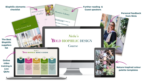 This is where you learn Bold Biophilic Design, our unique method that blends colour psychology with nature-rooted design to create spaces that feel calmer, brighter, healthier and happier.